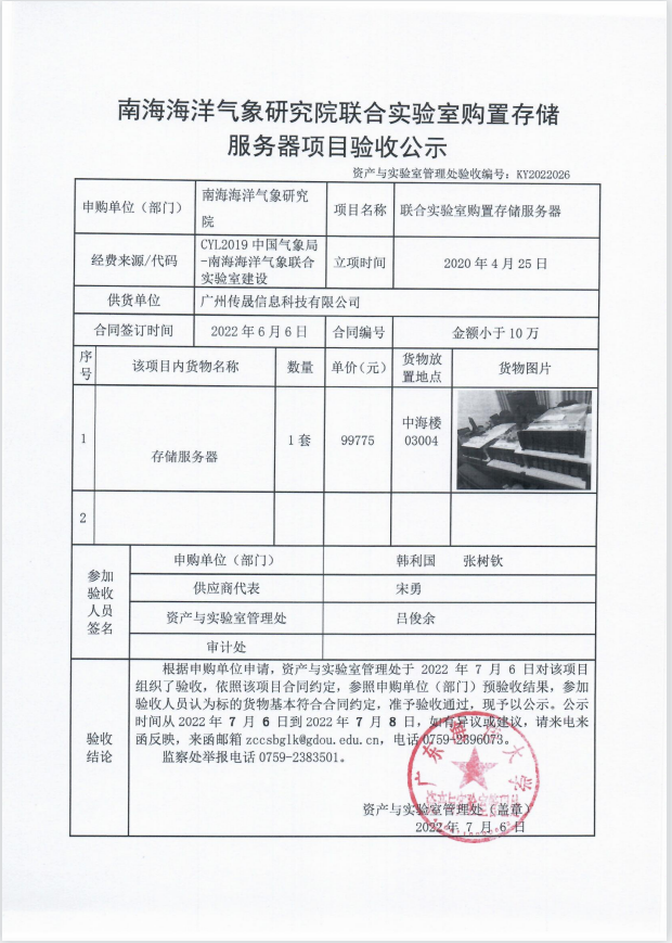 南海海洋气象研究院联合实验室购置存储服务器项目验收公示