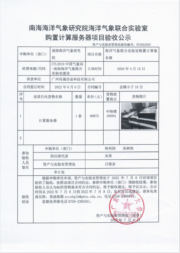 南海海洋气象研究院海洋气象联合实验室购置计算服务器项目验收公示