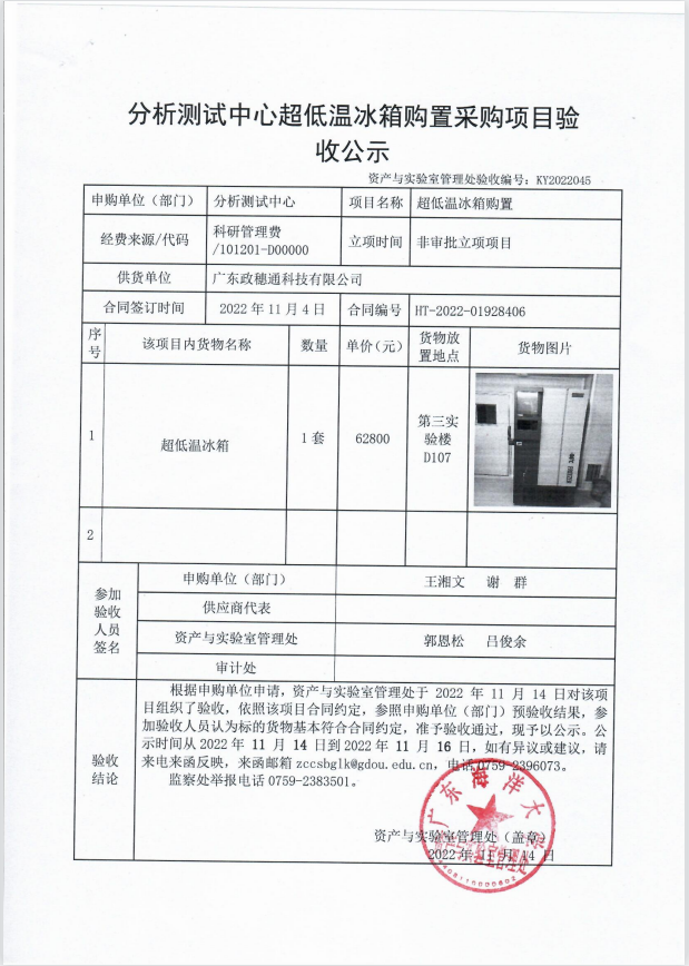 分析测试中心超低温冰箱购置采购项目验收公示