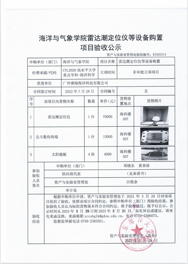 海洋与气象学院雷达潮定位仪等设备购置项目验收公示