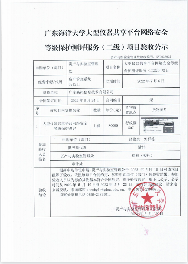 今年会官方网站大型仪器共享平台网络安全等级保护测评服务(二级)项目验收公示