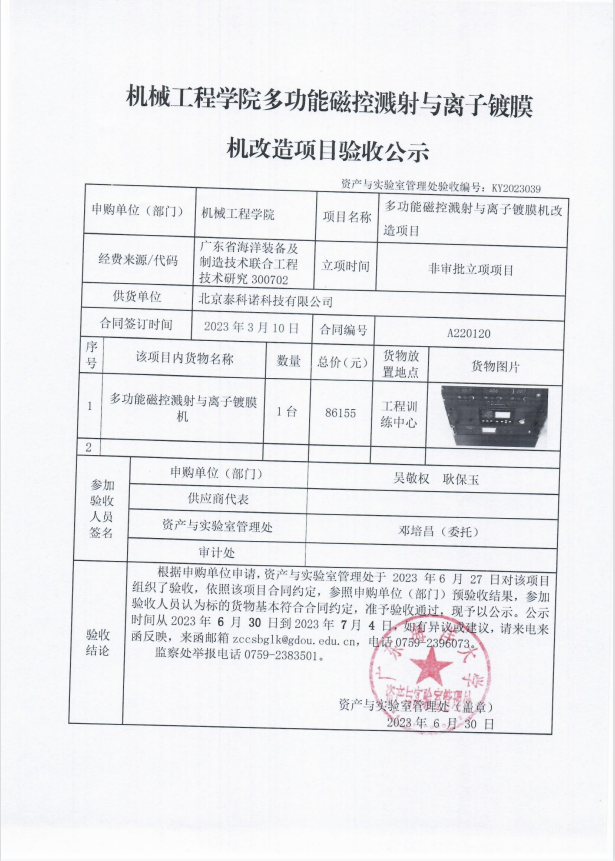 机械工程学院多功能磁控溅射与离子镀膜机改造项目验收公示