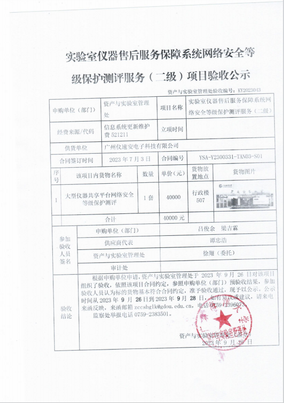 实验室仪器售后服务保障系统网络安全等级保护测评服务(二级)项目验收公示