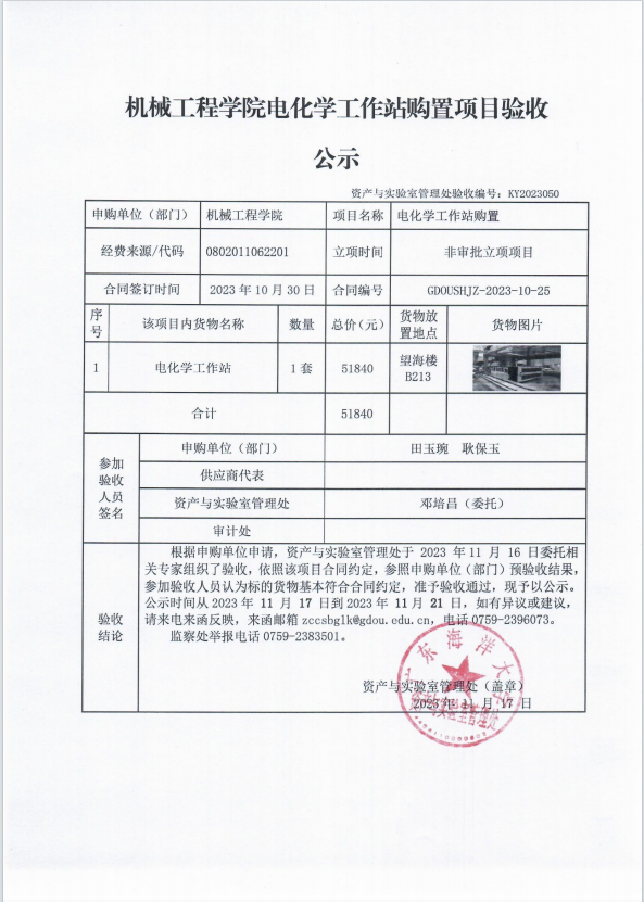 机械工程学院电化学工作站购置项目验收公示