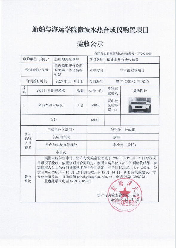 船舶与海运学院微波水热合成仪购置项目验收公示