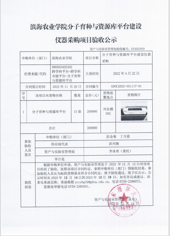 滨海农业学院分子育种与资源库平台建设仪器采购项目验收公示