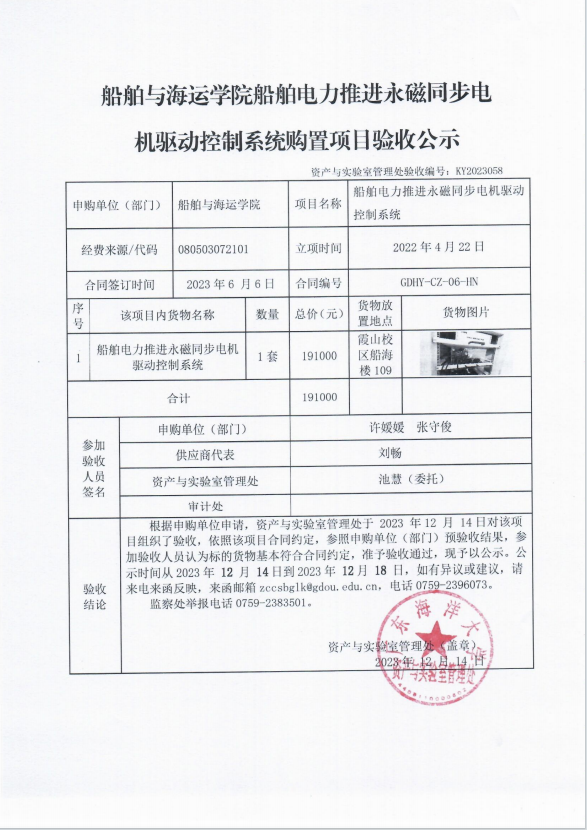 船舶与海运学院船舶电力推进永磁同步电机驱动控制系统购置项目验收公示