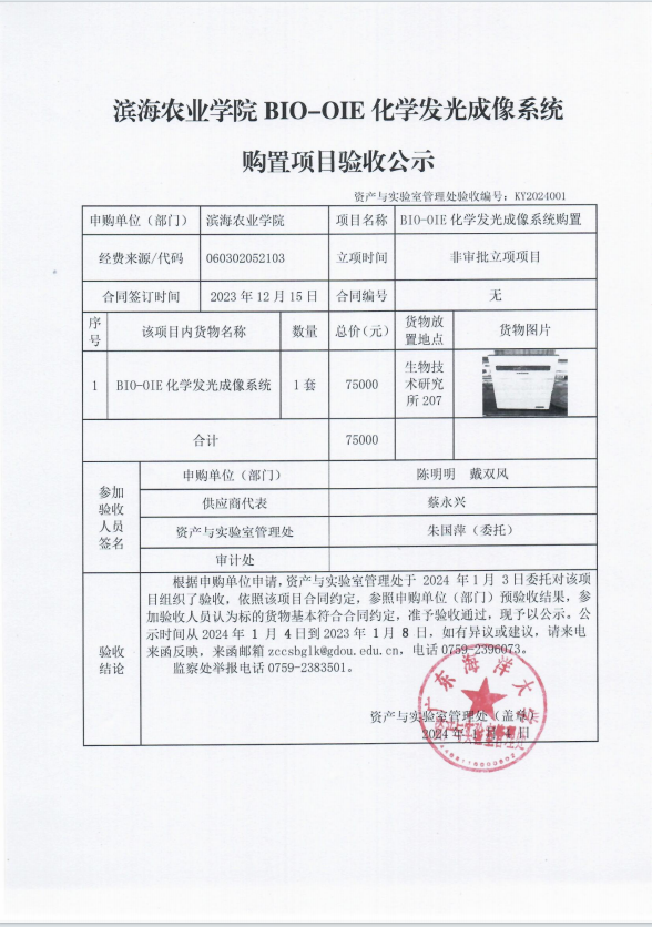 滨海农业学院BIO-OIE化学发光成像系统购置项目验收公示