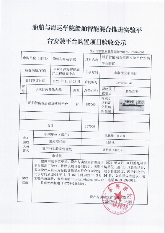 船舶与海运学院船舶智能混合推进实验平台安装平台购置项目验收公示