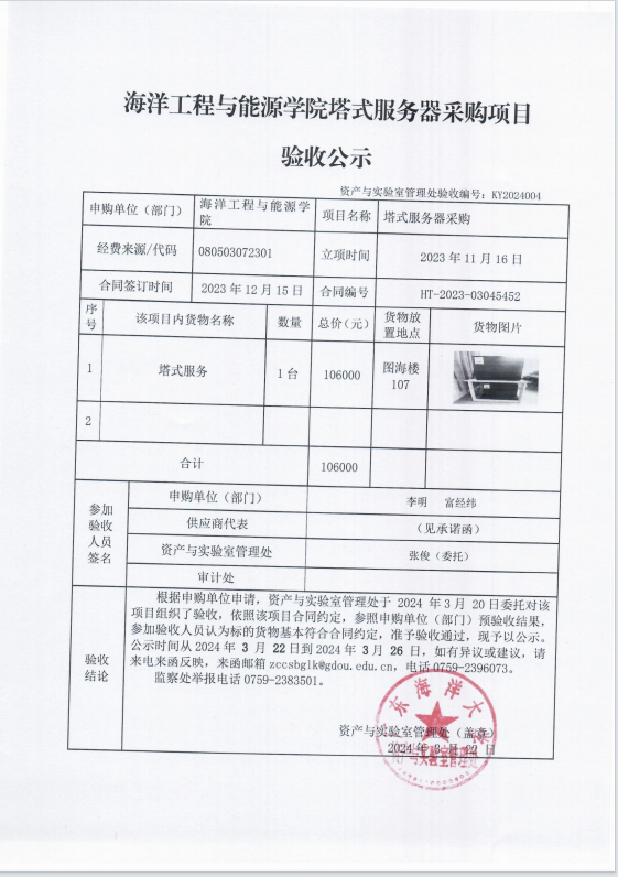 海洋工程与能源学院塔式服务器采购项目验收公示
