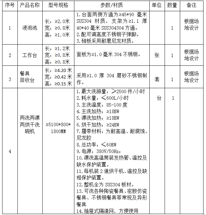 说明:除洗碗机参数、材质不得改变之外,其他设备均需要根据场地情况和采购人要求重新设计。